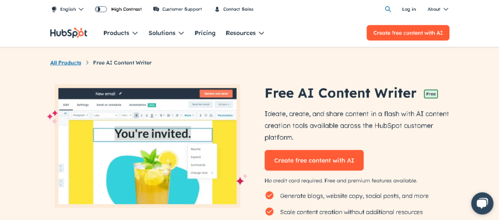 HubSpot’s free AI content writer specializes in marketing and sales copy with built-in conversion optimization features. The platform generates content specifically designed for lead generation, customer engagement, and sales conversion across multiple marketing channels. HubSpot’s AI understands marketing contexts and automatically incorporates persuasion techniques appropriate for different stages of the customer journey.