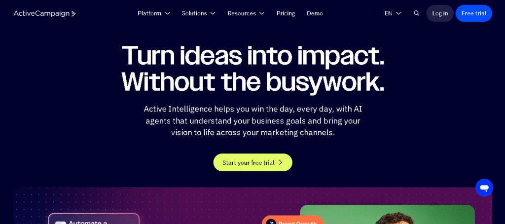 ActiveCampaign has positioned itself as a leader in AI-powered marketing automation with its 2025 launch of Active Intelligence, a comprehensive AI-first marketing orchestration platform. The system enables marketers to set goals and delegate routine tasks to a “behind-the-scenes AI team” that can build entire personalized, cross-channel campaigns automatically.